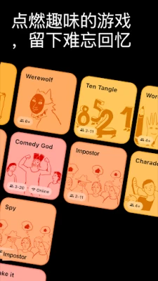 Social Gamebox 汇聚了海量精彩游戏,满足您不同场合的娱乐需求。从刺激烧脑的社交推理类,如考验洞察力的"狼人"或"间谍"游戏;到轻松爆笑的派对焦点,例如真心话大冒险、热手榴弹;以及专为情侣打造的亲密互动问答"丘比特";更有 Charades 等经典游戏之夜的必备环节。它支持多种游玩模式:亲友围绕一部手机轮流传递,或身处异地通过简单代码在线共享乐趣,甚至在旅途或没有网络连接的环境下也能完全离线畅玩,真正实现零门槛、秒开局的极致便利。